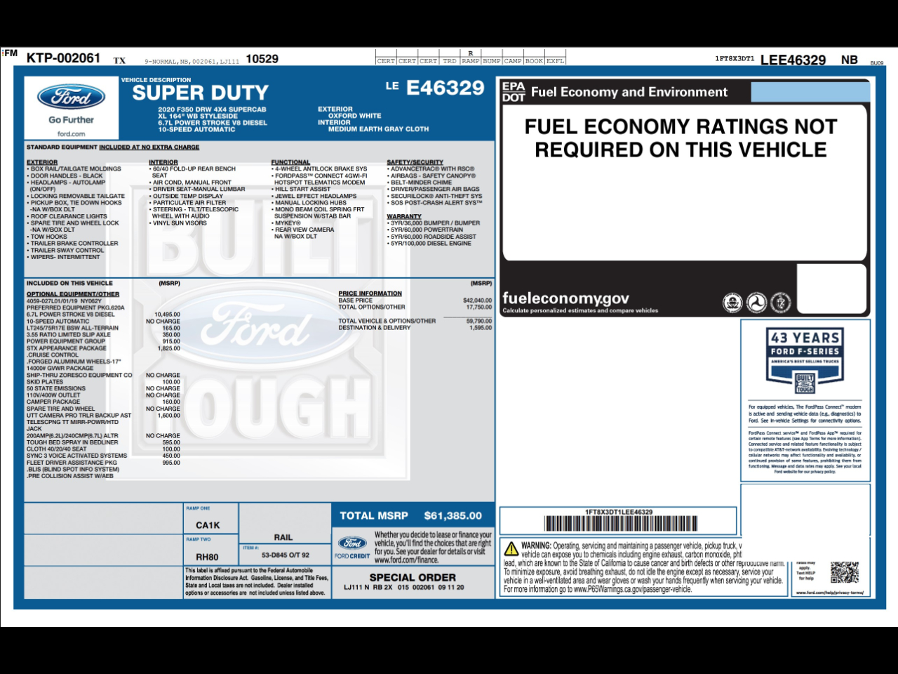 103,989 miles, 4WD, 8 Cyl ENGINE: 6.7L 4V OHV POWER STROKE V8 TURBO DIESEL B20