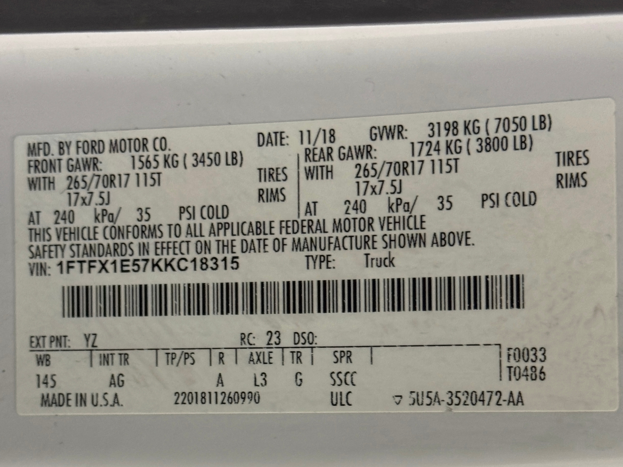 VIN: 1FTFX1E57KKC18315